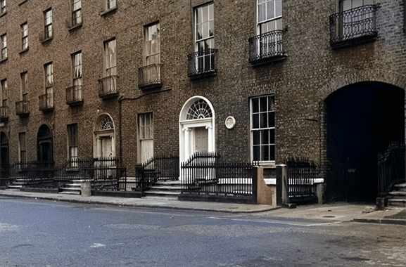 Two colorized photographs of the same address circa 1966; monochrome originals in the The Wiltshire Photographic Collection of the National Library of Ireland.
