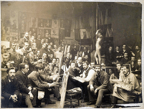 Undated photograph in the mid 1880s of students including Akseli Gallen-Kallela at Académie Julian, about ten years after George Moore studied there. All of these students are male whereas in the painting by Marie Bashkirtseff (and in other vintage photographs) all are female. Wikimedia Commons