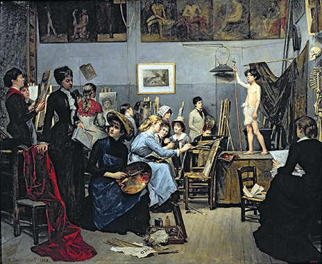 In the Studio (1881) by Marie Bashkirtseff (1858-1885); she is the student in the foreground looking over her shoulder. Wikimedia Commons