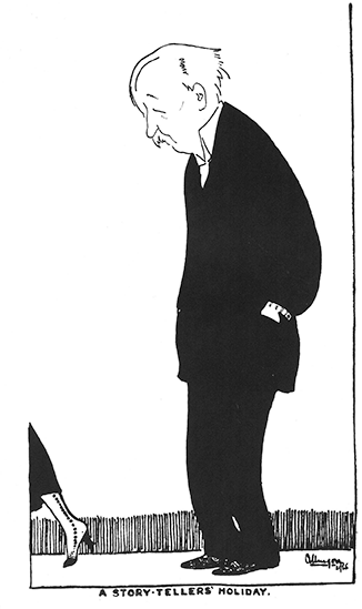 Signed Allinson and dated 1916. Captioned A Story-Tellers’ [sic] Holiday. Full length in profile turned to his right; a lady’s stockinged foot in a high-heeled shoe is exiting through the left border.