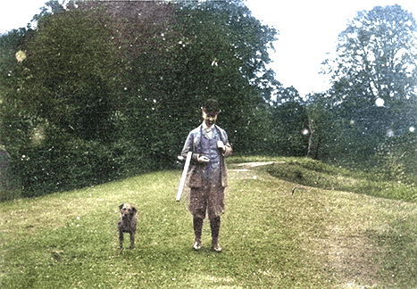 George Moore in a driveway bordered by trees at Coole Park, County Galway, Ireland, the home of Lady Augusta Gregory. Full length wearing tall boots and a tall bowler hat; holding an open shotgun over his right arm; his left hand gripping his waistcoat. A hound stands to his right.