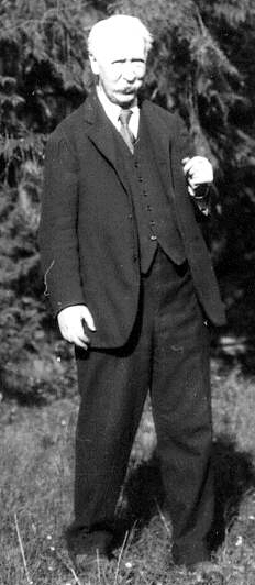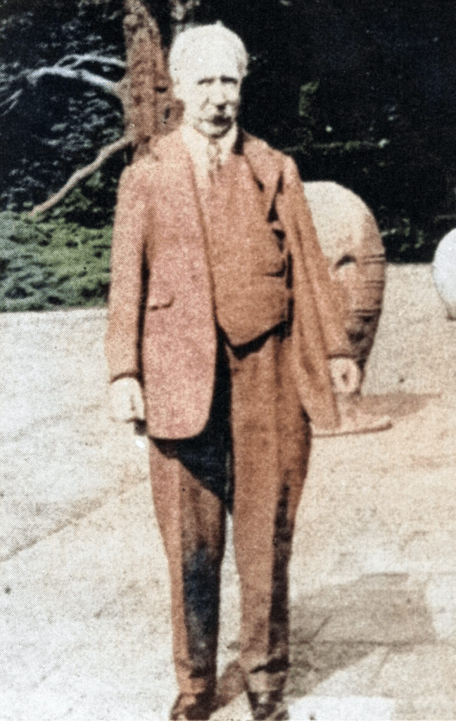 George Moore full-length on a paved terrace at the home of his friends Charles and Mary Hunter.