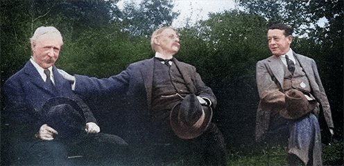 Captioned In William Heinemann’s garden at Oakham, 1919. George Moore is seated at left, turned slightly to his left, facing the camera; his close friend the author Edmund Gosse is seated in the center, the right hand on Moore’s left shoulder; the playwright C. Haddon Chambers is seated on the right side of the picture. Each man is jovial and holds a hat in his lap.