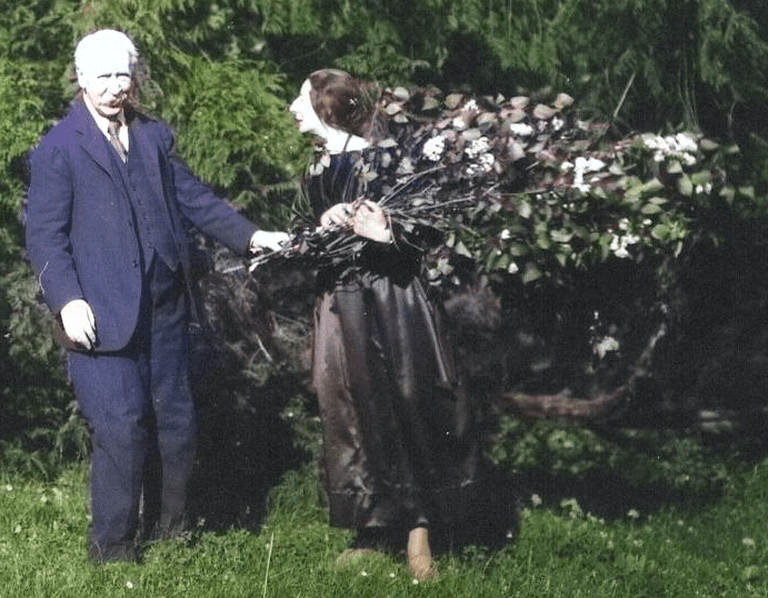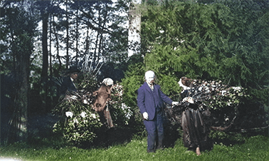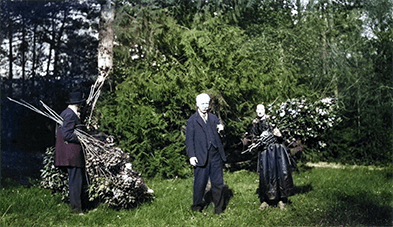 From left to right: Édouard Dujardin, Marie Dujardin, George Moore hidden behind Marie’s cuttings, and Wanda Landowska; all full length in the garden of Dujardin’s home Le Val Changis, Fontainebleau, France, after cutting the laurels. Present whereabouts unknown.