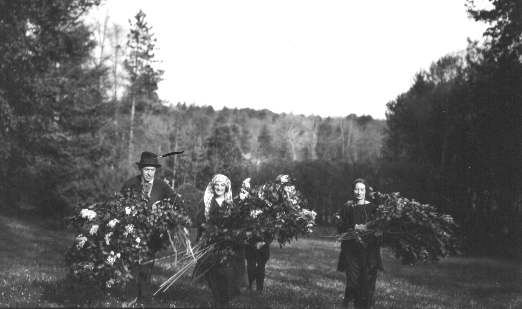 From left to right: Marie Dujardin standing behind her husband Édouard Dujardin, George Moore in the center, and Wanda Landowska; all full length in the garden of Dujardin’s home Le Val Changis, Fontainebleau, France. Moore’s raised left hand holds a sprig. Others hold bunches of cuttings.