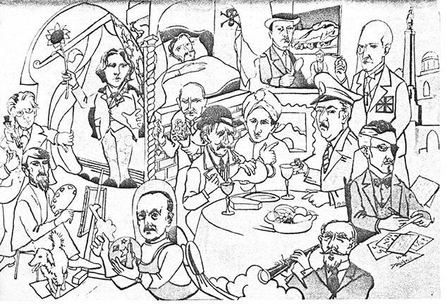 Caricature of George Moore and 12 other modernist authors. Moore is seated in the center filling his wine glass. Illegible signature of the artists in lower right corner.