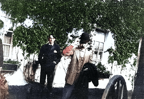 In front of the big house at at Coole Park, County Galway, Ireland, the home of Lady Augusta Gregory. George Moore three-quarter length, his right hand raised to his bowler hat, a coat draped over his left arm. William Butler Yeats is full length behind and to Moore’s right. A third figure, maybe Lady Gregory, is barely visible at the left border, looking at Moore. A carriage wheel is at bottom right. Moore wears the same outfit as in A Sportsman’s Sketch.