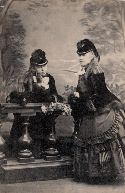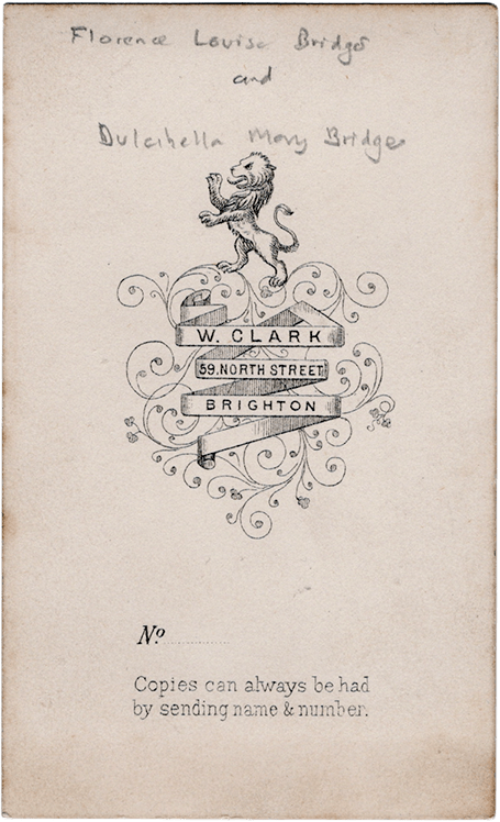 Florence Louisa Bridger (1856-1935), Dulcibella Mary Bridger (1859-1934) are pictured above-left in an undated carte-de visite in my collection. They were identified on the verso pictured above right, based on the handwritten caption in an antique album of the Orme family.