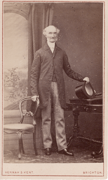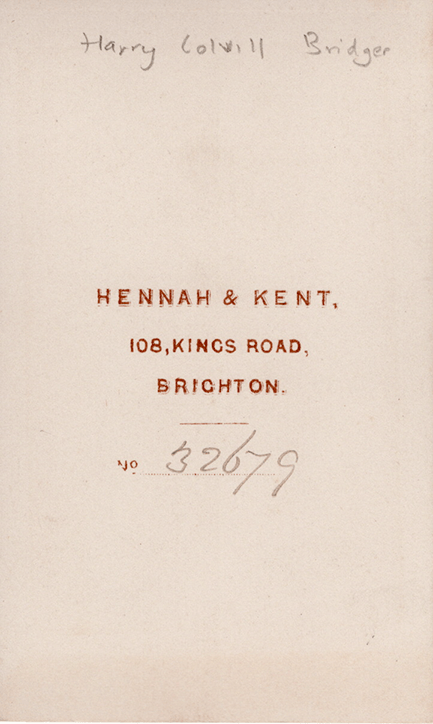 An undated carte de visite of Harry Colvill Bridger (1828-1910) in my collection. He was identified in the handwritten caption of an antique album of the Orme family, transcribed on the verso of the carte above right.