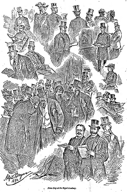 Captioned Press Day at the Royal Academy. Signed Alfred Bryan, 1892. A montage of figures including George Moore lower-right, in profile turned to his left, wearing a top hat and thoughtfully holding a pencil in his right hand raised to his chin. Also shown are Arthur A’ Beckett, Walter Armstrong, Joseph Ashby-Sterry, Edwin Bale, Henry Blackbum, J.F. Boyes, Frank Bumand, E.T. Cook, Harry Furniss, C. Lewis Hind, Marcus B. Huish, Phipps Jackson, Andrew Lang, Alice and Wilfred Meynell, Cosmo Monkhouse, James Orrock, Elizabeth and Joseph Pennell, Claude Phillips, Lionel Robinson, George Augustus Sala, Linley Samboume, M.H. Spielmann, R.A.M. Stevenson, Humphry Ward, Frederick Wedmore. The picture accompanies an illustrated article entitled “Art Critics of To-Day.”