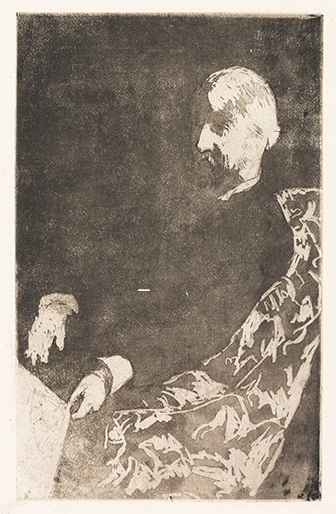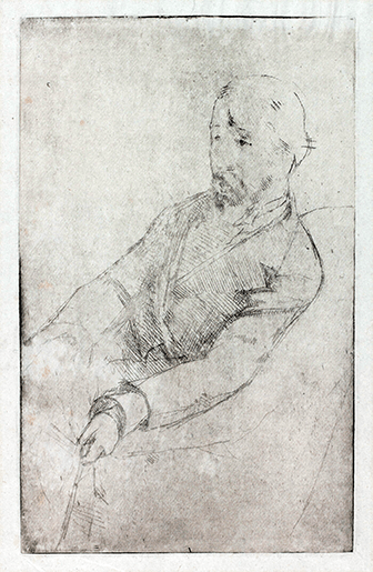 Inscribed on the sheet (verso), l.r. along bottom edge of sheet stamped in red ink: ATÉLIER \ ED. DEGAS [in oval]. First state: drawn in soft-ground outlines on unevenly toned background. George Moore with full beard, half-length turned to his right, seated in an upholstered armchair. The left hand holding a document (newspaper?). First state with features more distinctly drawn.