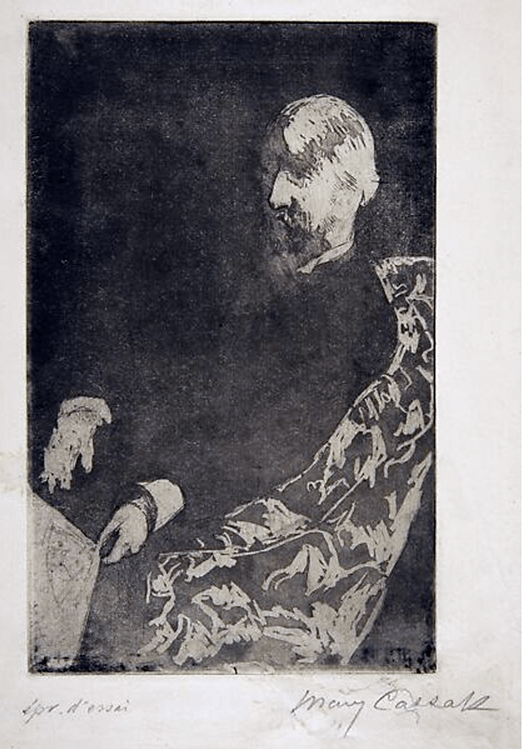 Signed (in lower right) Mary Cassatt. Inscribed (in lower left) [illegible]. George Moore with full beard, half-length turned to his right, seated in an upholstered armchair with a bold pattern. Both hands on his lap, the left hand holding a document (newspaper?). Second state: his features less distinctly outlined.