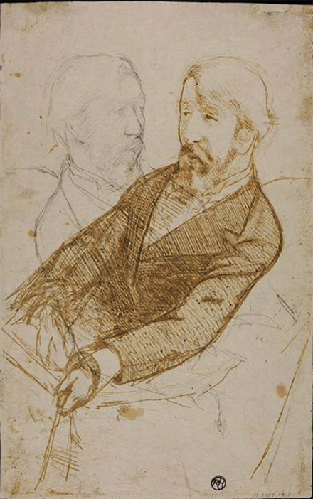 Inscribed l.l. in pencil: E.520; l.l. in pencil: [erased numbers & letters]; l.c. in pencil: moa; l.r. in pencil: Mary Cassatt / R.H.; verso l.c. stamped in ink: RH [encircled]. A study for an etching in a similar pose. Two half-length figures of George Moore with full beard, in the background only slightly drawn and turned to his left, in the foreground more clearly drawn turned to his right. The foreground figure is seated in an armchair, hands on lap holding an object (a newspaper?).