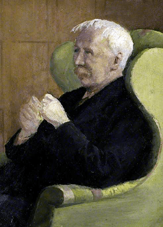 George Moore half-length seated in an upholstered armchair, elbows on armrests, raised fists, turned to his right.