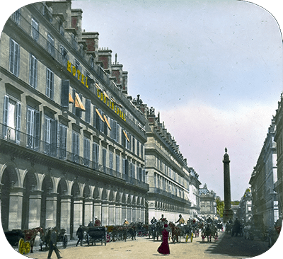 Opposite the Hôtel Continental on the left, a view in 1900 up the Rue de Castiglione looking towards the Place Vendôme. Wikimedia Commons