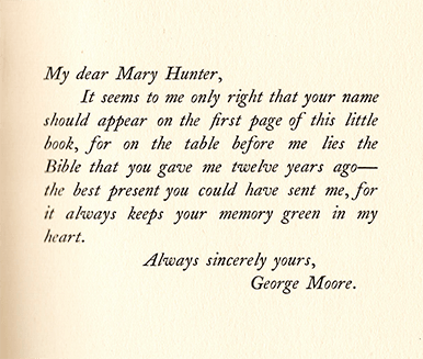 Mary Symth Hunter (1856-1933) was a prominent hostess and patron of the arts. Starting in the 1890s, George Moore was her dear friend and frequent house guest at Selaby Hall and later at Hill Hall.