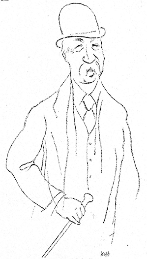 Captioned Drawing by Kapp, No. 90. Signed Kapp. George Moore half-length turned slightly to his left, wearing a bowler hat, holding a stick in his right hand.