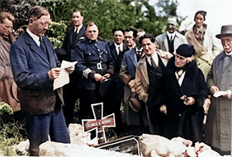 Below Richard Best, director of the National Library of Ireland, reads an elegy by George Russell at the funeral of George Moore in 1933. Nina is on the right side of the picture, standing next to her brother Maurice on Castle Island, Lough Carra, where George Moore had imagined the end of his life in a story named “Resurgam,” in Memoirs of My Dead Life.