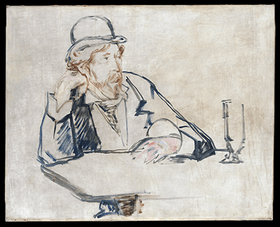 This painting may be a study for Manet’s definitive portrait of Moore seated in the Nouvelle Athènes, where the two men first met in 1877. Moore wrote that the definitive portraits was destroyed by the dissatisfied artist.