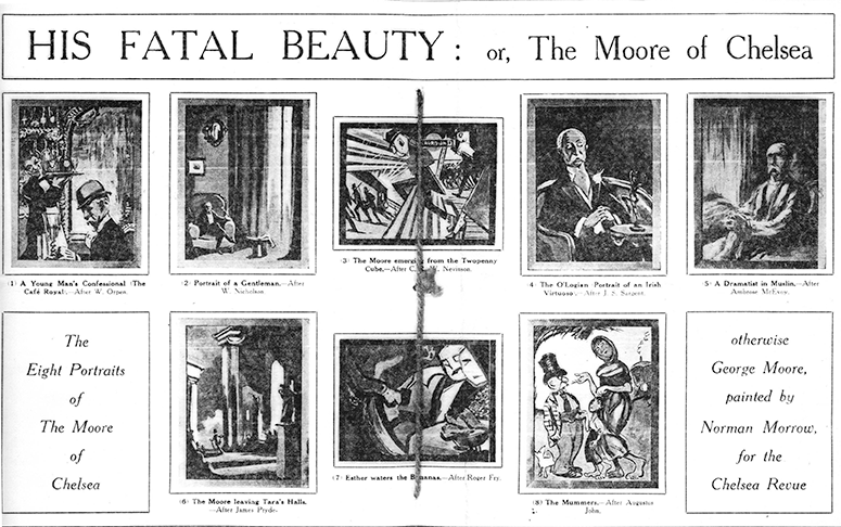 Captioned Scene Paintings for E.V. Lucas’ His Fatal Beauty: or, The Moore of Chelsea, Chelsea Palace, 20 March 1917. Eight paintings satirizing Moore’s frequent sittings: 1. A Young Man’s Confessional (The Cafe Royal). – After W. Orpen. 2. Portrait of a Gentleman. – After W. Nicolson. 3. The Moore emerging from the Twopenny Cube. – After C.R.W. Nevinson. 4. The O’Logian Portrait of an Irish Virtuoso. – After J.S. Sargent. 5. A Dramatist in Muslin. – After Ambrose McEvoy. 6. The Moore leaving Tara’s Halls. – After James Pryde. 7. Esther waters the Bananas. – After Roger Fry. 8. The Mummers. – After Augustus John.