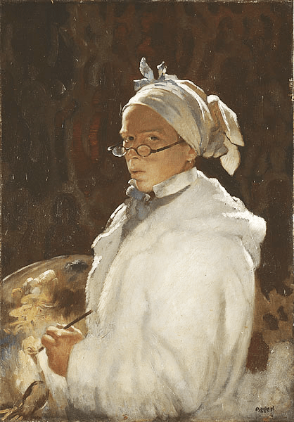 Signed lower right: Orpen. Half-length, turned to his right, holding a palette in his right hand and a brush in his left hand, staring intently at his sitter. Depicting the artist at work the way George Moore, as a sitter, would have observed him.