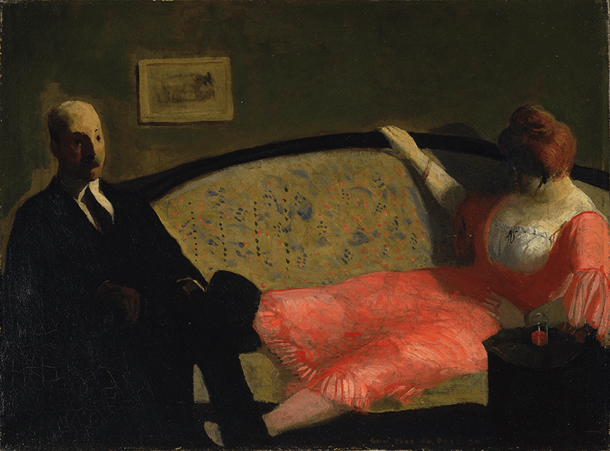 Signed and dated at lower right Guy Pene de Bois 20. George Moore full-length, seated on the left side of the picture, half-turned to his left, hat perched on his knee, beside a sofa where a woman with red hair in a red dress reclines, with a tumbler containing a red beverage on a small table to her left.