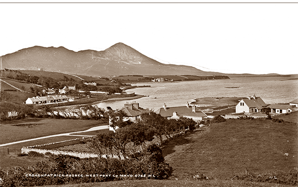 Undated vintage photograph of Rosbeg, Westport with Croagh Patrick in the background (see National Library of Ireland). Thanks to James Kelly, Westport Historical Society, for bringing this picture to my attention.Detail of the top photograph showing Rossymailley House center-background, across the bay from the photographer and in front of the mountain.