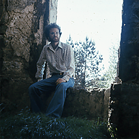 It’s a photograph of me aet. 26, during my first visit to Moore Hall. I am sitting inside a window of the ruin, posing for my camera perched a few feet away.