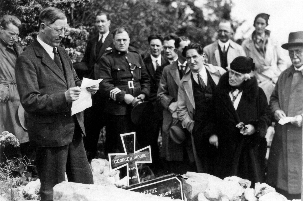 George Moore died at his London home on 21 January 1933 aet. 80. He was cremated after a small civil ceremony on 25 January. In a moving essay entitled “Resurgam” (Memoirs of My Dead Life) and in conversation, he had wished for his ashes to be scattered on Lough Carra, but on 27 May “it seemed appropriate” to bury the urn on a small, desolate island in the lake, about a mile from the now ruined house where he was born. This photo was taken that day; it shows George’s brother Maurice at far right, standing next to his sister Nina. The scholar Richard Irvine Best, director of the National Library of Ireland, reads a sort of lukewarm eulogy by George Russell (AE), who is not present. The urn is still where they left it, and why “it seemed appropriate” to put — and keep — it there is another story altogether.
