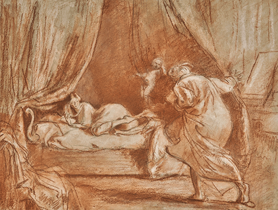 In a boudoir, George Moore full-length in voluminous nightshirt and slippers, approaches a seductive young woman in a canopied bed. Cupid hovers between them.