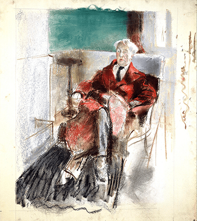 Geroge Moore full-length seated on an upholstered chair, half-turned to his right, arms on the arm rests, wearing a necktie and a red dressing gown.