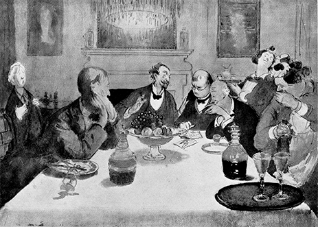 Captioned The Conversation Then Turned on Tonks. George Moore half-length half-turned to his left, hands gripping his lapels, disconcerted and seated alone at the left border of the picture. Seated around dinner table center are Lawrence Alexander Harrison, Philip Wilson Steer, Henry Tonks, Nelson Ward; and two servers standing in the right side of the picture.
