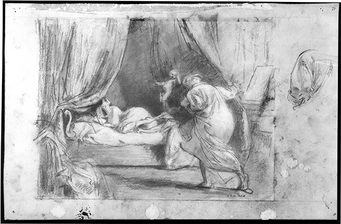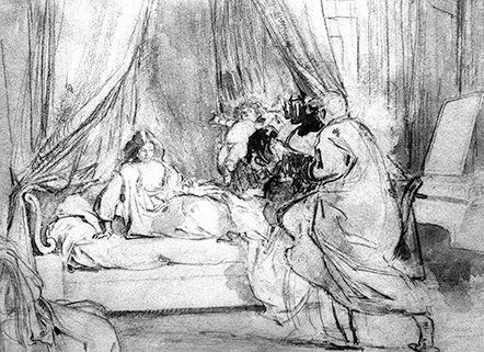 Henry Tonks made “a series of little pictures” for Moore’s story “The Lovers of Orelay” in Memoirs of My Dead Life (1906) beginning in 1920. Some were exhibited at the New English Art Club Retrospective Exhibition (London, January 1925) and again at the Tate Gallery (London, 6 October until 15 November 1936). In 1936 one of the pictures was subtitled Night, another Morning. Owners named in the exhibition catalog (see below) include Lady Kendall-Butler, Miss Ethel Sands, and Mr. St. John Hutchinson.
