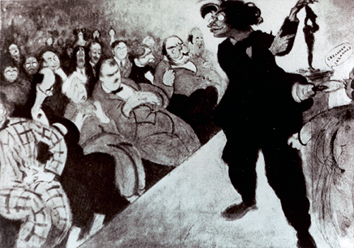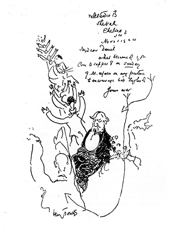 Inscribed Vale Studio B, The Vale, Chelsea, SW3. Nov 26 1924. My dear Daniel, What became of you? Come to supper 8 on Sunday. G.M. refuses on any pretense to encourage bad English. Yours ever, Henry Tonks. George Moore full-length in evening clothes, angrily seated and puffing a cigar, while others including the artist at a banquet table rise to acclaim a dignified person in the middle ground.
