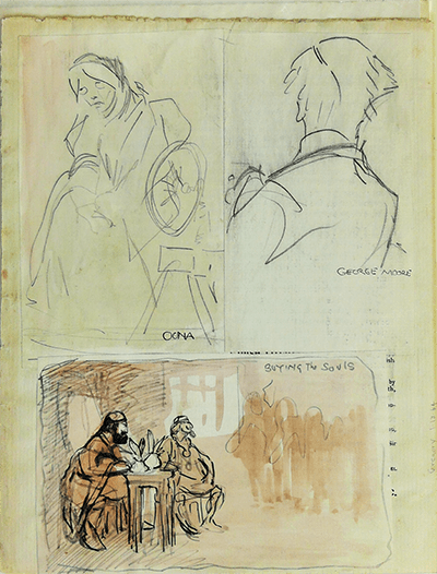 George Moore half-length in profile turned to his left, holding a sheaf of papers, to the right of the marquee on the cover of Beltaine (February 1900). Inscribed George Moore under the marquee. Five other names are inscribed and two heads are captioned The Editor [William Butler Yeats] and The Artist (by AE) [Jack Butler Yeats].