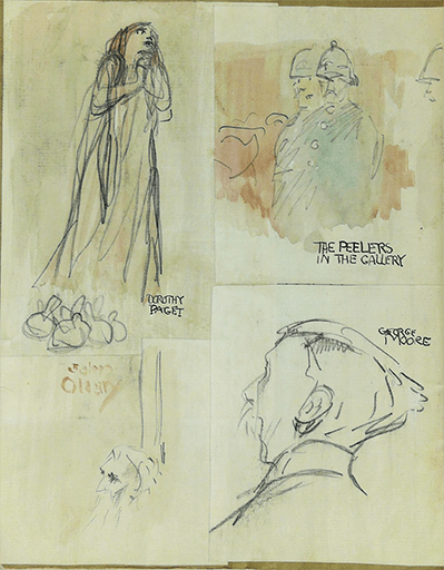 George Moore head and shoulders looking to his left, seen from behind. Pasted inside the front cover of Beltaine (Dublin, 1 May 1899). Captioned George Moore. Other drawings on the page are captioned Dorothy Paget, The Peelers in the Gallery, and John O’Leary.
