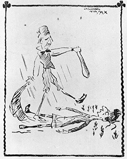 Captioned (In commemoration of a Glorious Victory.) Sandy makes closer acquaintance with the Heather Field. Compliments to Max and the “Daily Chronicle”. Signed: Jack B Yeats after MAX. George Moore full-length turned slightly to his left, his left leg raised as though to stomp. A shillelagh in his left hand, a tartan dangling from his right hand, a peasant cap on his head. William Archer full-length prone on the ground beneath Moore’s raised foot, wearing traditional Scottish clothing.