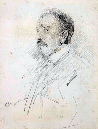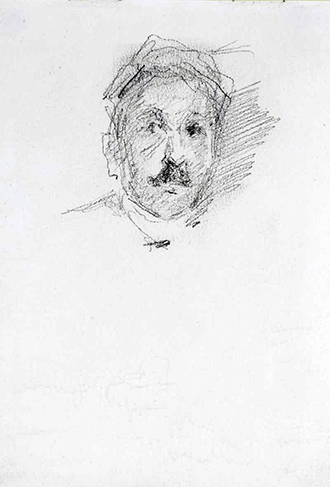 Inscribed George Moore. George Moore half-length in profile turned to his right. Dated by Joseph Hone in J.B. Yeats, Letters to His Son W.B. Yeats and Others (1944). This sketch was made in the Kildare Street Club, Dublin purportedly as a study for the oil painting now in the National Gallery of Ireland.